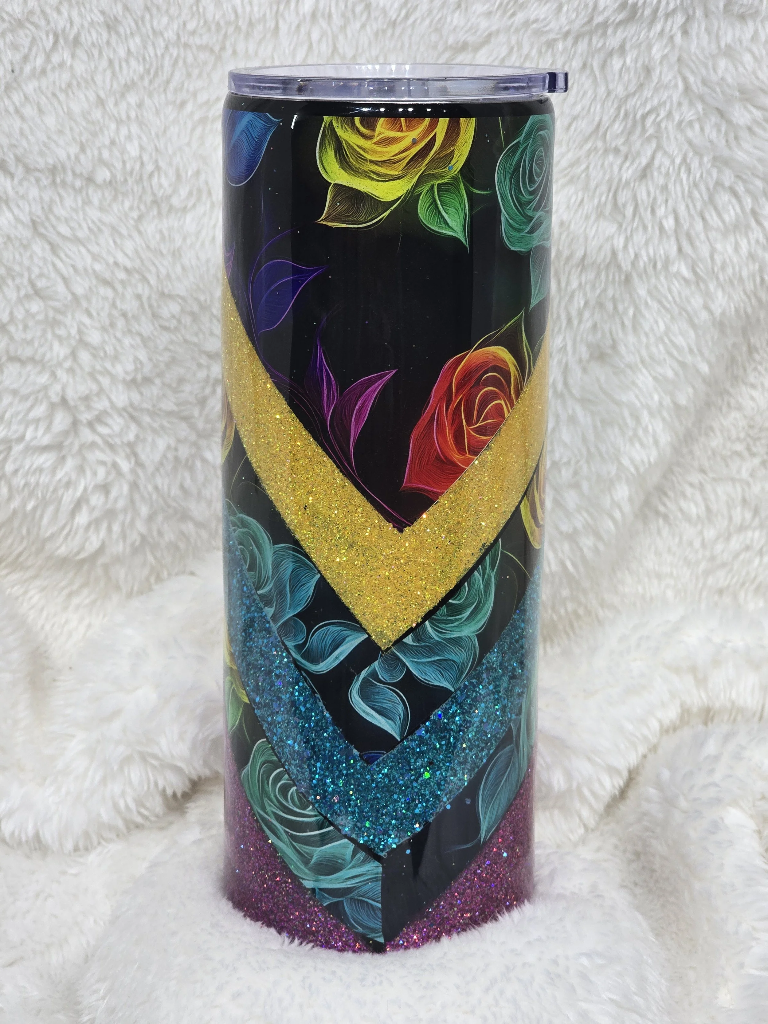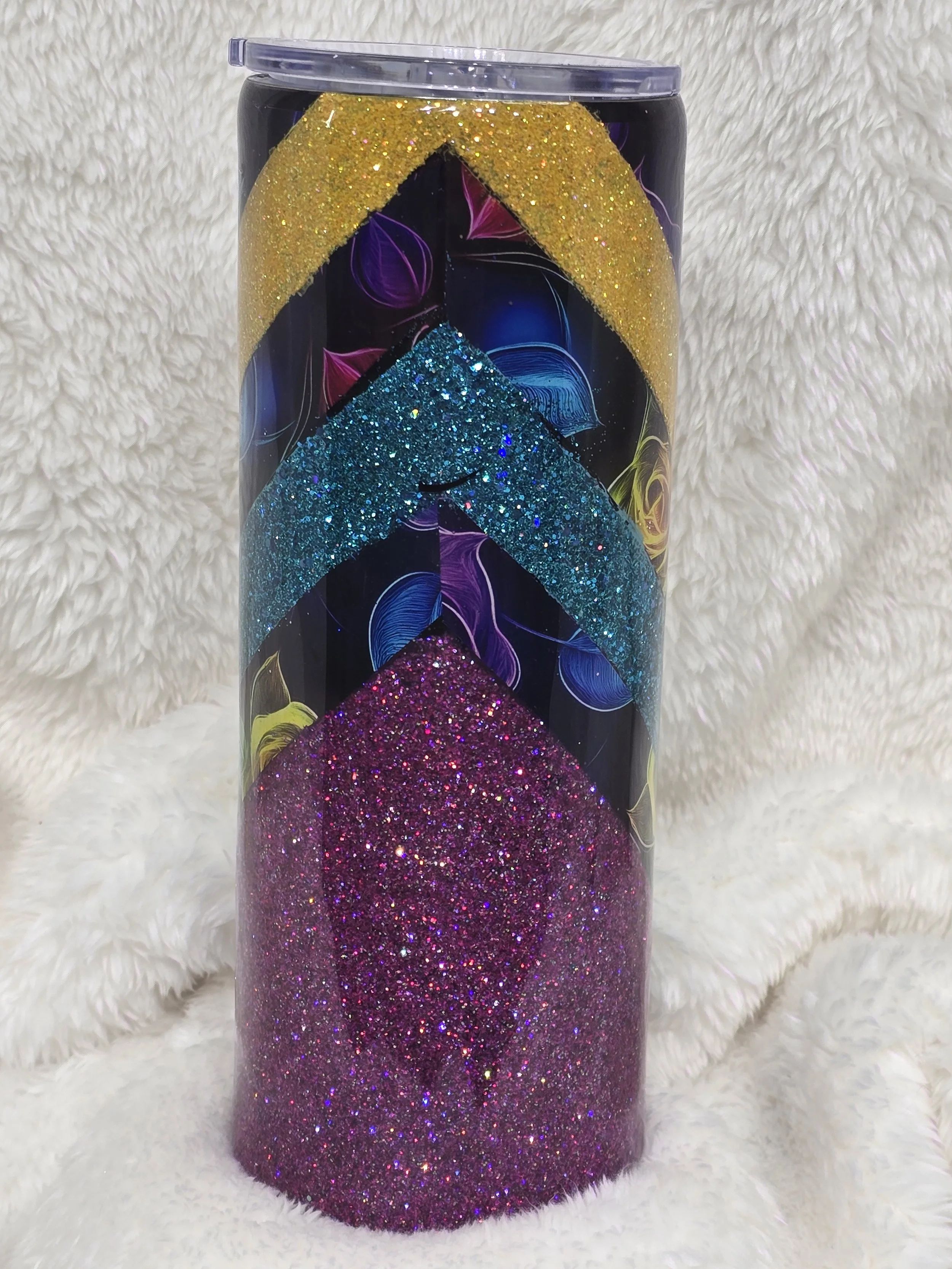 20 oz stainless steel tumbler designed with a combination of vinyl and glitter topped off with the perfect glassy epoxy finish
